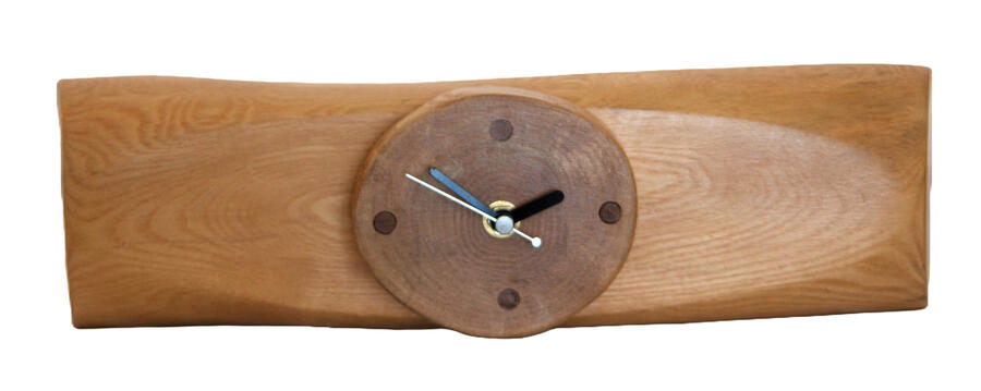 A rustic clock embedded in a natural piece of wood. The clock face is seamlessly integrated into the wood's surface, with small wooden inlays marking the hours. Metallic hands indicate the time, and the wood's grain and imperfections add to its organic, artistic charm. It's both a functional timepiece and a decorative object.