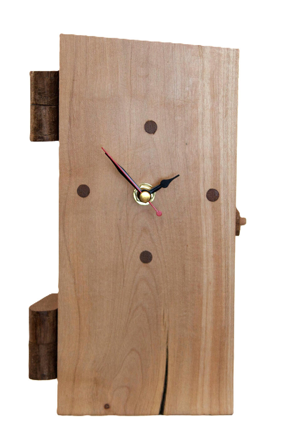 Handcrafted wooden clock with a minimalist and rustic design. The clock face is a rectangular slab of light-colored wood, featuring natural grain patterns and a vertical crack near the bottom that adds character. Four dark wood circular inlays mark the positions of 12, 3, 6, 9. The clock hands—black for the hour and minute, and a thin red second hand—are mounted at the center. The overall aesthetic blends functionality with organic artistry.