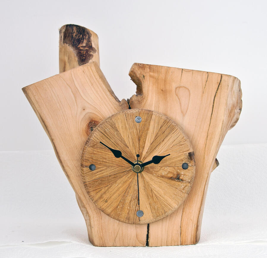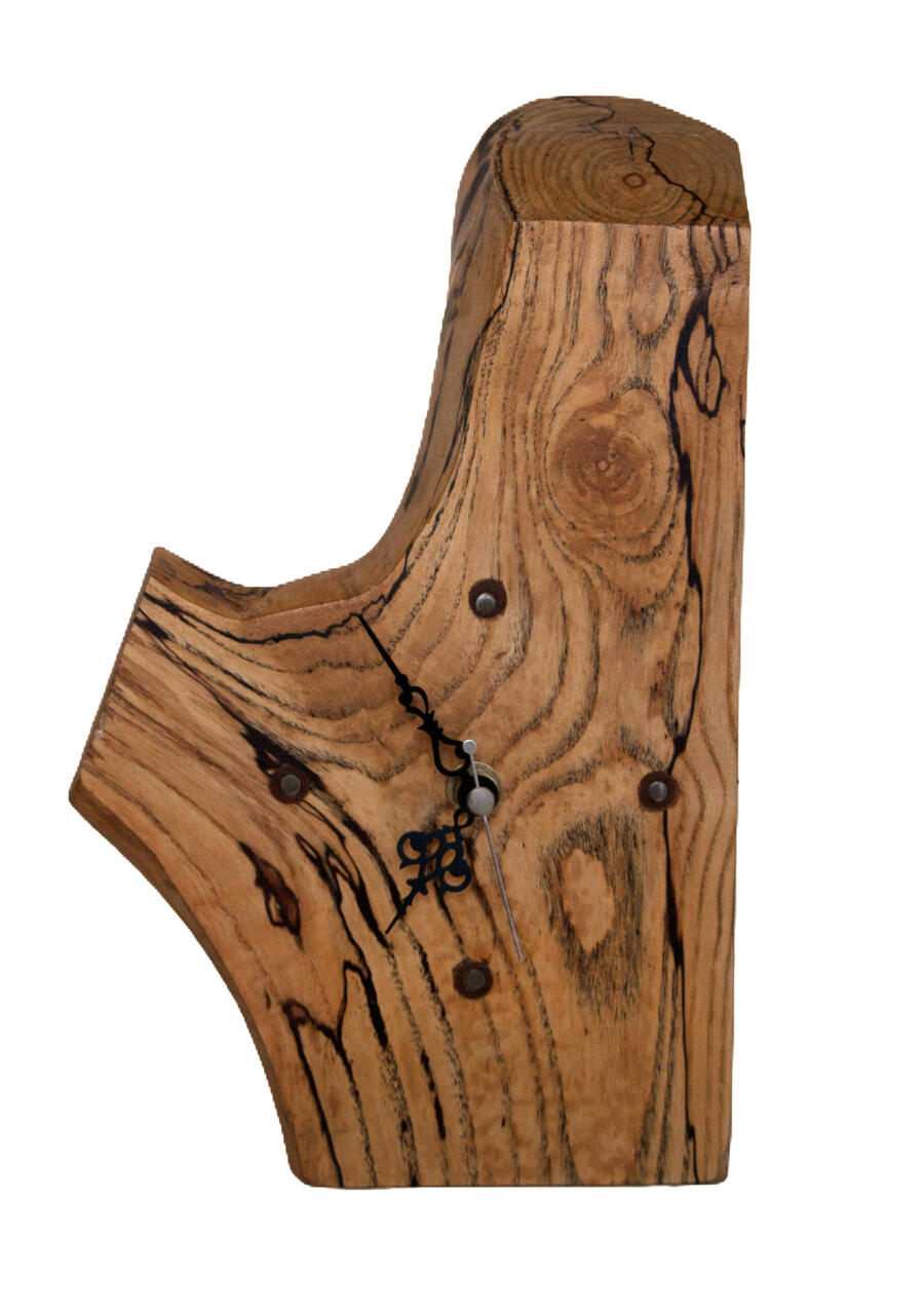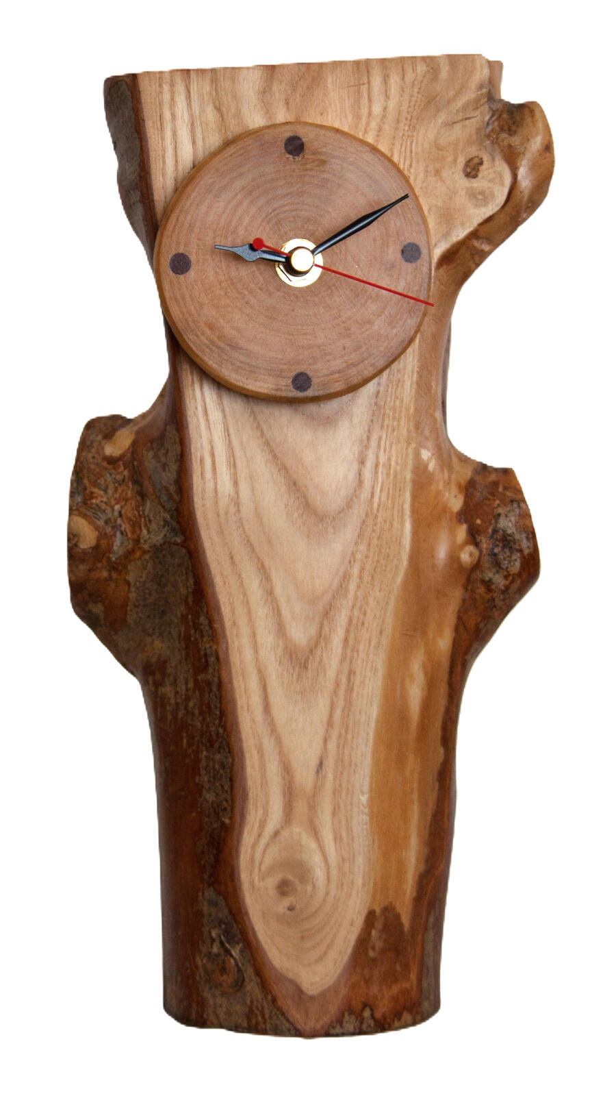 A handcrafted wooden clock with a sculptural, branched shape. Its natural wood grain and embedded metal accents give it a rustic, artistic feel. The clock face is set into the wood, featuring ornate black hour and minute hands and a simple silver coloured second hand. This clock can be displayed in both the horizontal or vertical plane.