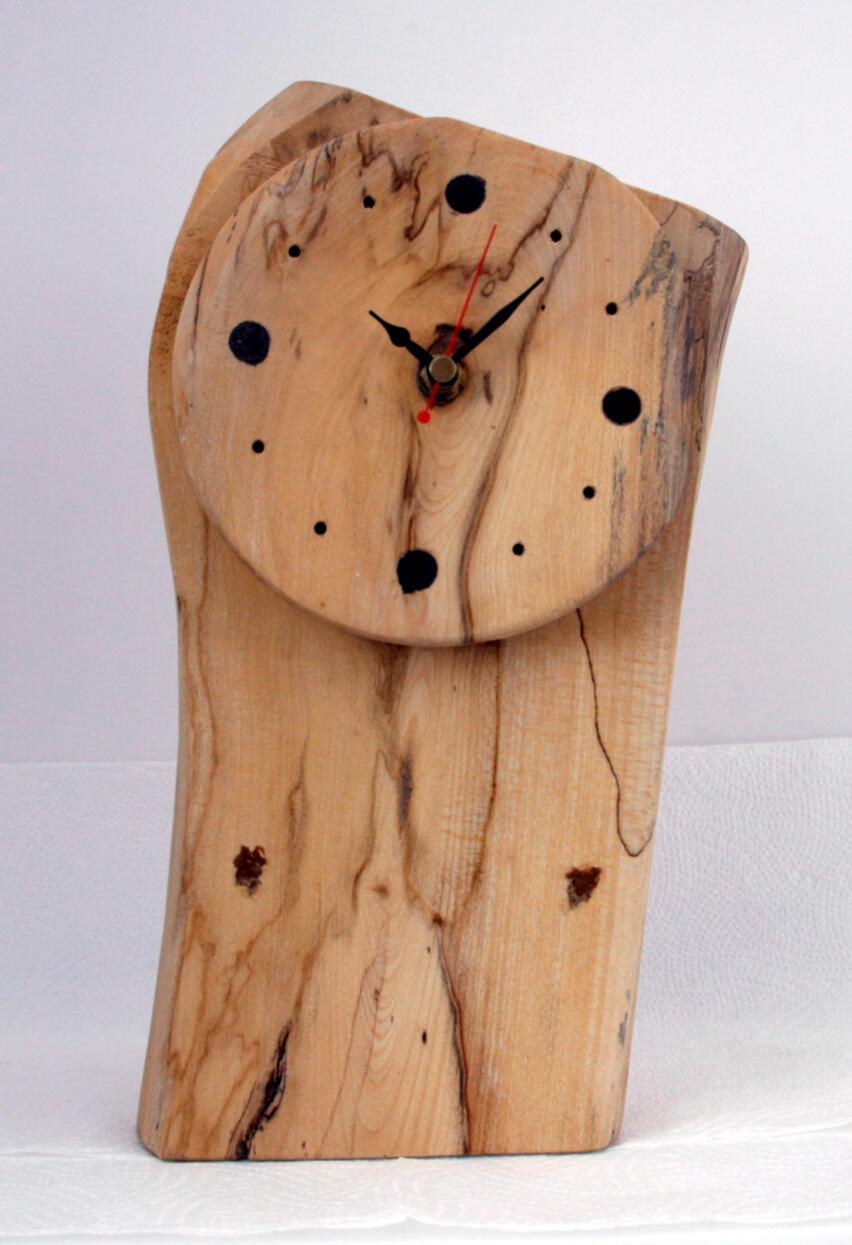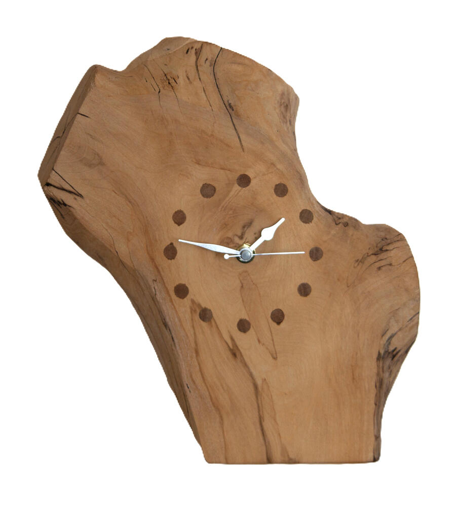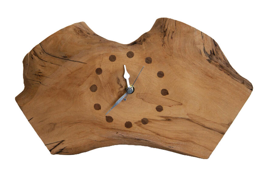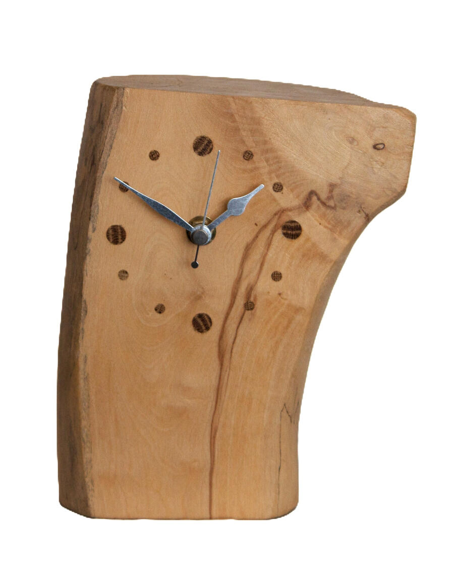 A rustic clock crafted from a natural piece of wood. The clock face is embedded directly into the wood, with small circular hour markers and metallic hands that stand out against the organic grain. The wood retains its irregular, natural shape, showcasing knots and imperfections that give it a warm, artistic character. It's both a functional timepiece and a decorative object with earthy charm. The wood is possibly Birch.