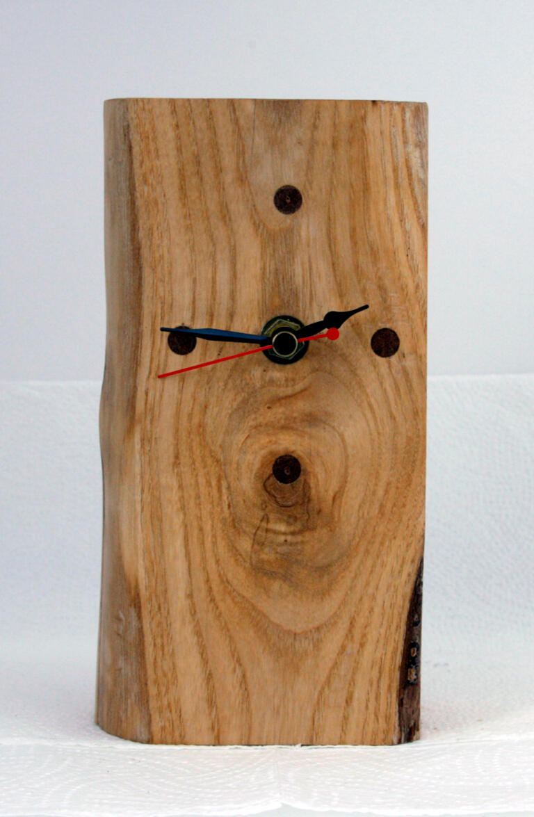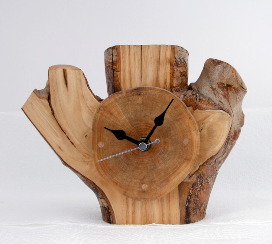 A rustic clock embedded in a natural piece of wood. The clock face is seamlessly integrated into the wood's surface, with small wooden inlays marking the hours. Metallic hands indicate the time, and the wood's grain and imperfections add to its organic, artistic charm. It's both a functional timepiece and a decorative object.